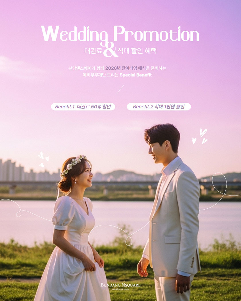 이벤트 상세 혜택 대관료 & 식대할인 혜택 2026년 웨딩 잔여타임 예식을 준비하는예비 부부께만 드리는 Special Benefit 이벤트 기간 : 2026/03/27 ~ 계속 TEL : 031-728-5300 이벤트 혜택 혜택 1) 대관료 50% 할인혜택 2) 식대 1만원 할인자세한 사항은 예약실로 문의주세요.대표 전화 031-728-5300 이벤트 기간 2026/03/27 ~ 계속 이벤트 대상 2026년 잔여타임 계약 고객 이벤트 조건 ※ 26년 3월 27일이후 신규 계약자에 한함 목록 이전 이벤트 대기시간 없는 사전 상담 예약 다음 이벤트 다음 이벤트가 없습니다.